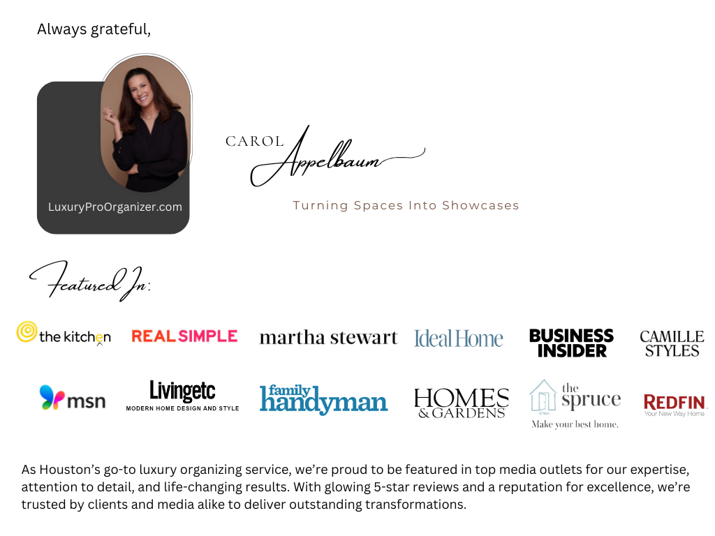Services like Luxury Pro Organizer will organize and stage your entire space so you won't need to lift a finger. Luxury Pro Organizer will also show you easy-to-follow, easy-to-manage strategies to simplify your life. Want to learn more?